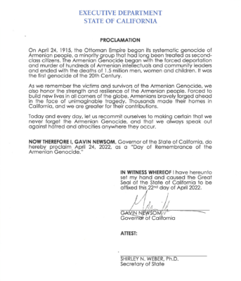 SACRAMENTO – Governor Gavin Newsom today issued a proclamation declaring April 24, 2022 as “A Day of Remembrance of the Armenian Genocide” in the State of California.